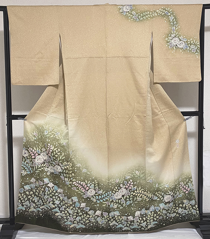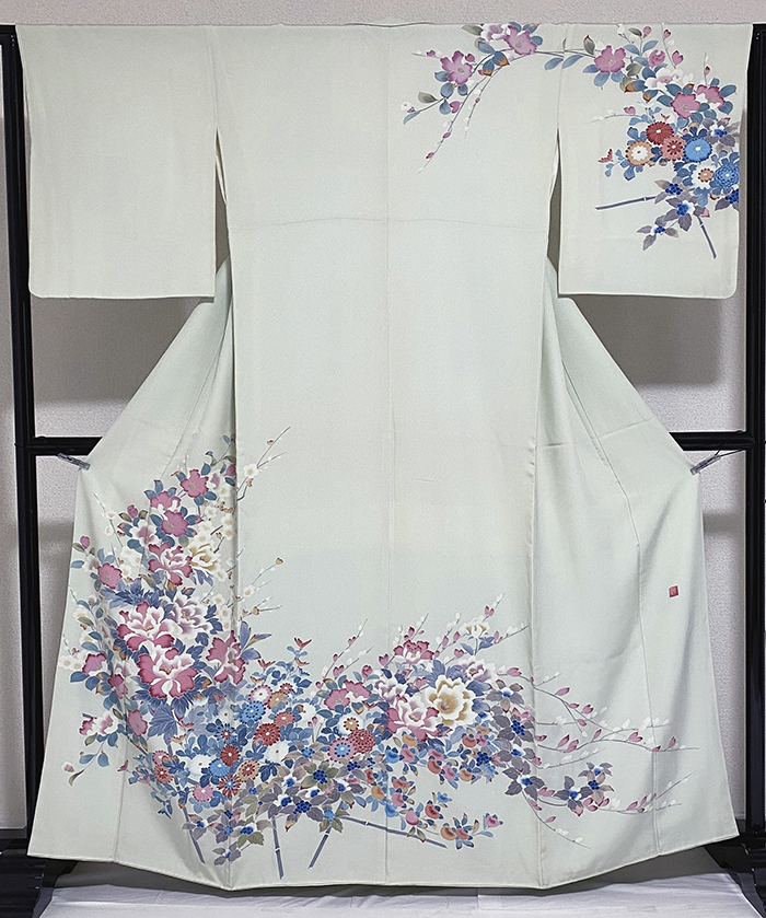張りのある手触りの変わり一越の生地をくすんだ薄緑色に地染めし、上前からの牡丹などの花柄を紅梅色や青ネズと金茶などの加賀糸目友禅で丁寧に重ね染めした品。八掛けは正絹表色無地でオクミ裏に柄を置き胴裏は正絹が付いた手縫い仕立て。衿裏にはくるみホックが付いています。下前オクミに落款があります。