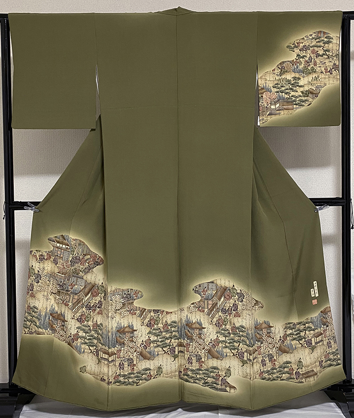 スベリの良い手触りの変わり一越の生地を深いウグイス色に地染めし、上前からの薄茶暈しに御所風景の柄を薄エンジ色やベージュ色に紫色や少しの金彩を加え重ね染めした品。八掛けは正絹表色無地でオクミ裏に柄を置き胴裏は正絹が付いた手縫い仕立て。下前オクミに作家落款があります。