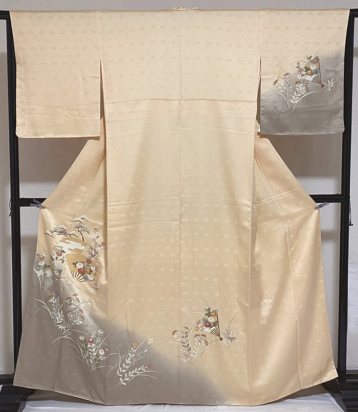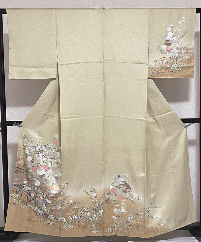 張りのある手触りでアラレの地柄を織り込んだ紋意匠の生地を薄緑が加わった優しいベージュ色に地染めし、上前からの金茶暈しと、几帳や橋・花などの柄を生成り胡粉と茶色や薄紫色・紅梅色と金銀彩などで重ね染めした品。八掛けは正絹表色無地でオクミ裏に柄を置き胴裏は正絹が付いた手縫い仕立て。