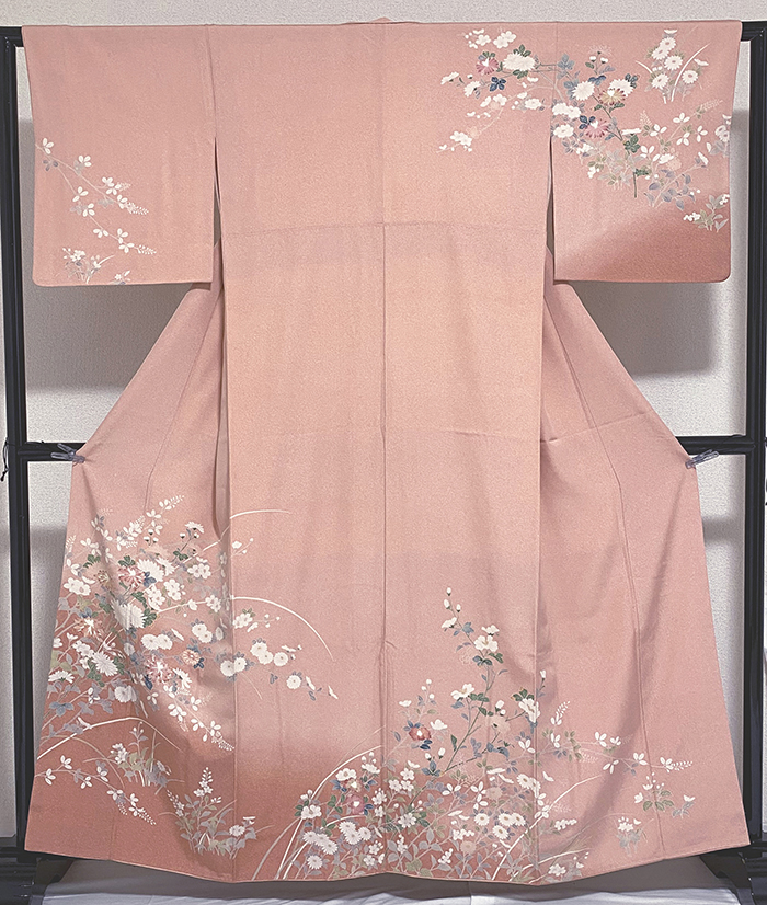 張りのある手触りの変わり一越の生地をくすんだピンク色濃淡に地染めし、上前からの濃いめ地色の裾暈しと、萩や菊などの花柄を緑や金茶と白ネズなどの加賀糸目友禅で重ね染めした品。八掛けは正絹表色無地でオクミ裏に柄を置き胴裏は正絹が付いた手縫い仕立て。衿裏にはホック代わりに糸が付いています。