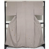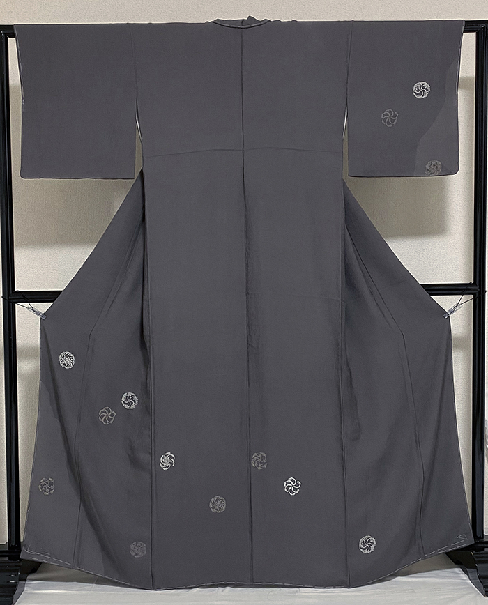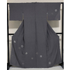 しなやかでやわらかな手触りで五月雨の地柄を織り込み、上前からのねじ梅調の華紋柄を薄紫色に白と少しの銀糸の防染糸で織り込んだ紋意匠の生地を緑みの濃いグレーに地染めし、上前の流水取りグレーの染め分けで重ね染めした品。八掛けは正絹表色無地でオクミ裏に柄を置き胴裏は正絹が付いた手縫い仕立て。衿裏にはくるみホックが付いています。
