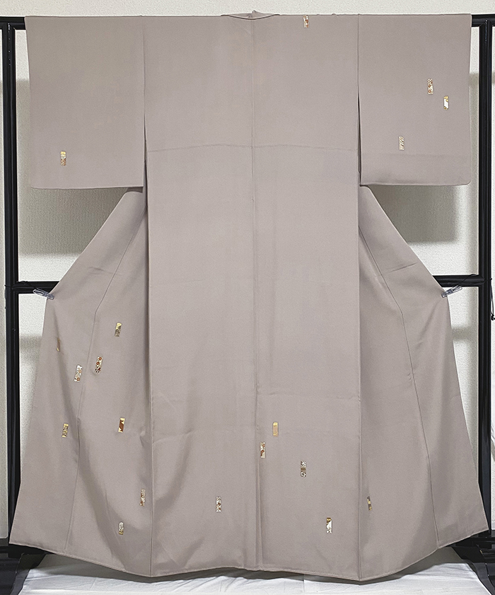 スベリの良い手触りの変わり一越の生地を優しいくすんだ梅ネズ色に地染めし、上前からの小さな短冊取り花などの柄をエンジ色や白に金彩を加え重ね染めし、少しの金駒刺繍を加え仕上げた品。八掛けは正絹少しのローズ色が加わったベージュ色暈しで胴裏は正絹が付いた手縫い仕立て。衿裏にはホック代わりに糸が付いています。