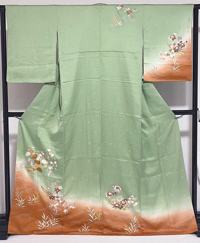 スベリの良い手触りで光沢のある花サヤガタの地柄を織り込んだ上質な紋意匠の生地をエメラルドグリーン色に地染めし、上前からの黄赤の裾暈しと、猪牙舟や枝垂れ梅など花の柄を黄赤色や薄紫色に白などで重ね染めし、少しの金彩と黄赤などの色糸刺繍と金駒刺繍を加え仕上げた品。八掛けは正絹黄赤暈しで胴裏は正絹が付いた手縫い仕立て。黄赤の正絹重ね衿が付いています。