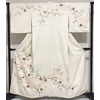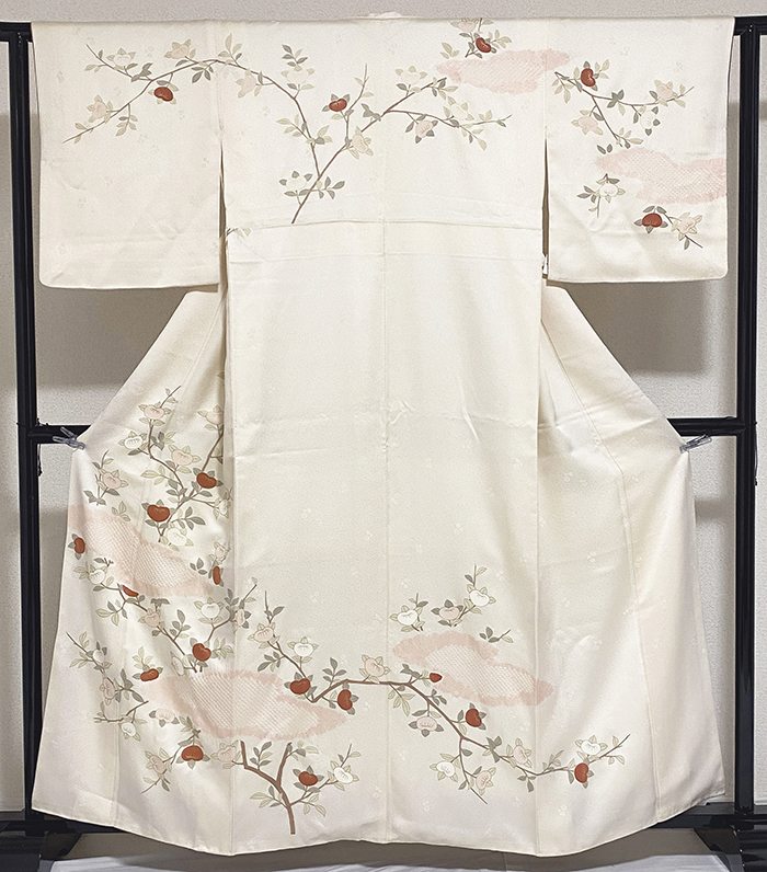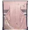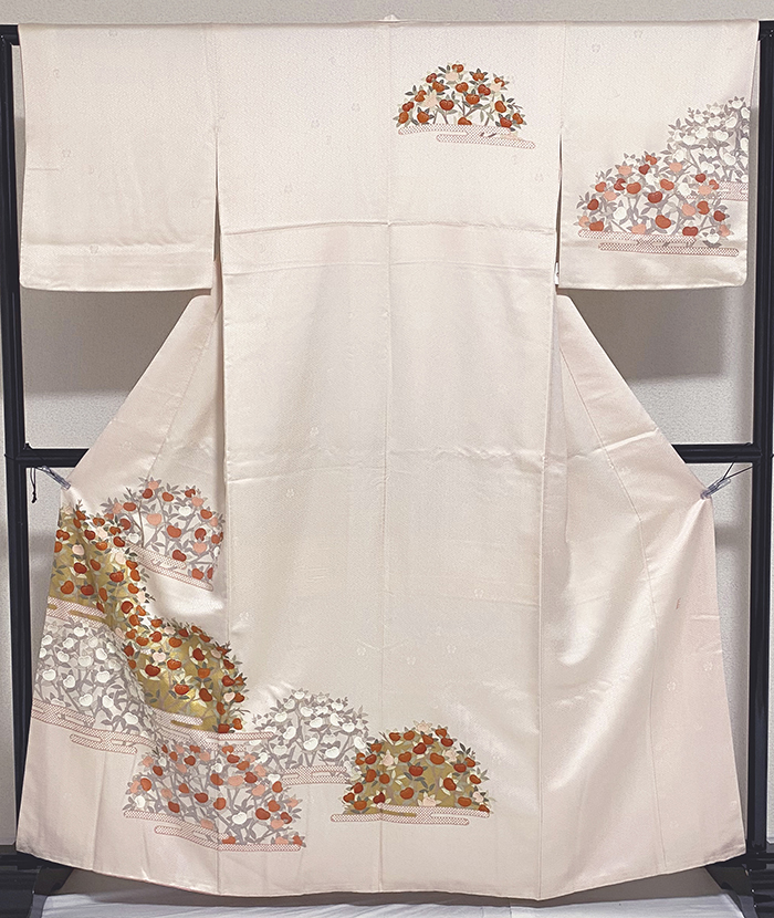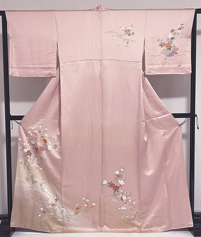 しなやかな手触りの小さなアラレ柄を織り込んだ光沢のある緞子織り生地で、優しいピンク色の地色に染め、上前や胸の花柄を黄赤色や珊瑚色に薄緑色と白で金彩を加え、裾には金彩暈しを施した品。八掛けは正絹ピンク色無地でオクミ裏に柄を置き胴裏は正絹が付いた手縫い仕立て。衿裏にはホック代わりに糸が付いています。