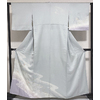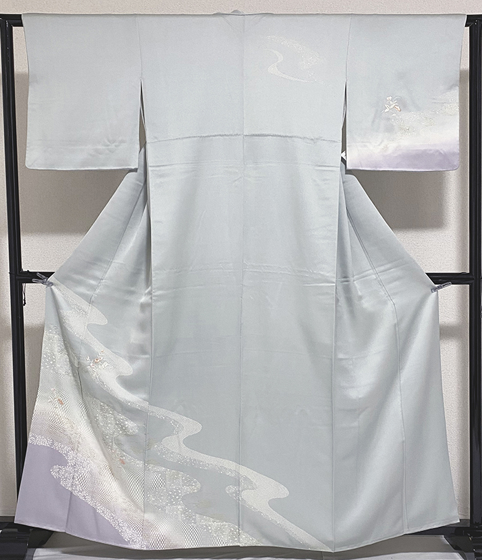 しなやかな手触りの良い細かな縞とその上にサヤガタを織り込んだ光沢のある紋意匠生地で、くすんだ青ネズ色は水色に近く、裾には薄藤色で暈し、胸や上前の流水柄を白の染料と金彩で染め、その上の花柄を白ネズ色と淡い珊瑚色で刺繍し仕上げた品。八掛けは正絹白ネズ色無地で胴裏は正絹が付いた手縫い仕立て。