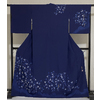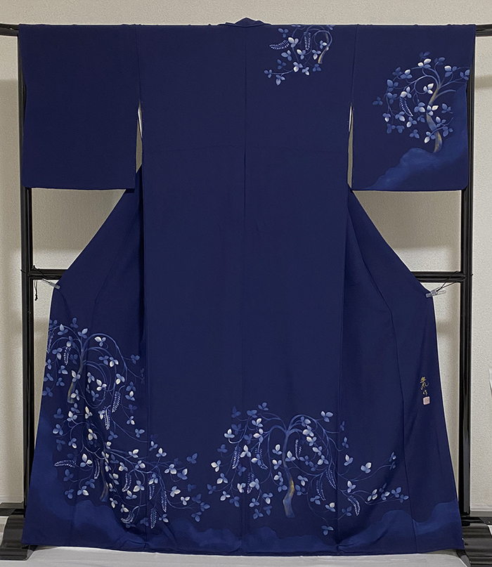 確りとした良い手触りの変わり一越織り生地で、深い紺色に染め、木立と花柄を地色濃淡と白ネズ色に少しの金彩を木立に染めた加工の品。八掛けは正絹表色無地でオクミ裏に柄を置き胴裏は正絹が付いた手縫い仕立て。下前オクミに作家落款があります。