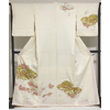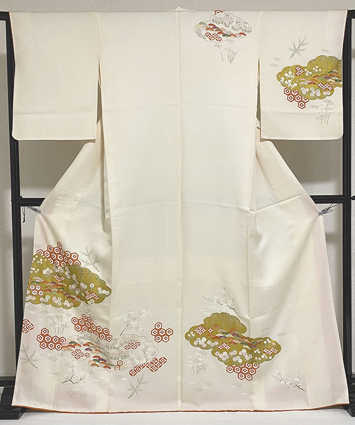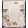 しなやかな手触りの紋意匠無地織り生地で、生成りの白の地色に染め、上前や胸の柄を金彩雲柄と黄赤色や紫色に緑色と、小花に刺繍を加えた加工の品。八掛けは正絹黄赤色暈しで胴裏は正絹が付いた手縫い仕立て。衿裏にはホック代わりに糸が付いています。