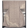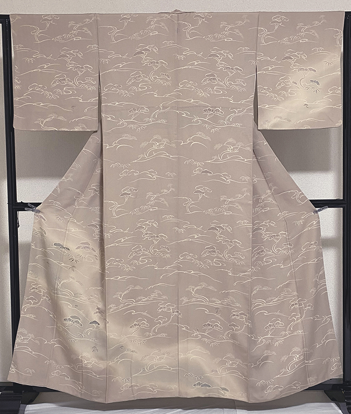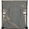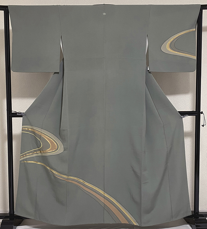しなやかなスベリの良い手触りの紋意匠無地織り生地で、くすんだ薄緑色の良い色に染め、上前の胸の流水柄にベージュ色や金茶色に赤紫色と金彩加工で染めた品。八掛けは正絹くすんだベージュ暈しで胴裏は正絹が付いた手縫い仕立て。