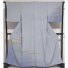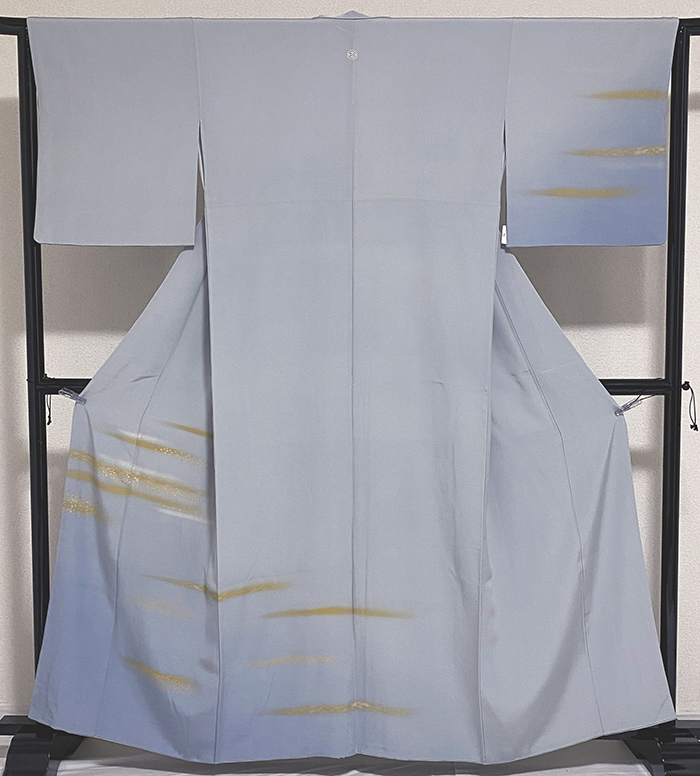 しなやかな手触りの変わり一越織り生地で、淡い青ネズ色のくすんだ水色に染め、裾には濃いめで暈し、上前や胸の横段霞柄を金彩と金銀霞柄に染めた加工の品。八掛けは正絹表色無地でオクミ裏に柄を置き胴裏は正絹が付いた手縫い仕立て。