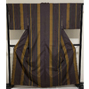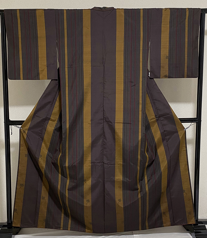 しなやかな薄手の張りのある紬の地織りに染めを加えた品で、細縞を青ネズ色とエンジ色とベージュ色で織り、金茶の部分には松葉や小槌などの柄を少しの黄赤を加えて染めた織りと加工の品。八掛けは正絹エンジ色無地で胴裏は正絹が付いた手縫い仕立て。衿裏にはくるみホックが付いています。