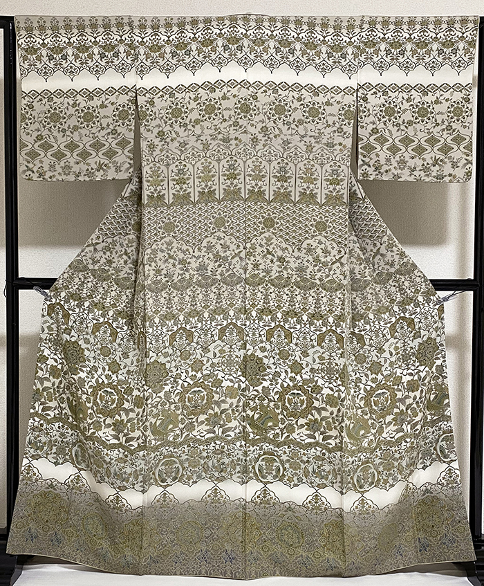 しなやかな手触りの趣のある小さなフシを織り込んだ紬織り生地で、くすんだ藤ネズ色の地色に染め、その上の龍や鳳凰に花などの柄を薄緑色や薄紫色と少しの黄赤色を加えて染め、縁取りに金彩を施した品。八掛けは正絹藤ネズ色無地でオクミ裏に柄を置き胴裏は正絹が付いた手縫い仕立て。衿裏にはくるみホックが付いています。