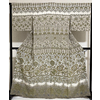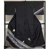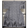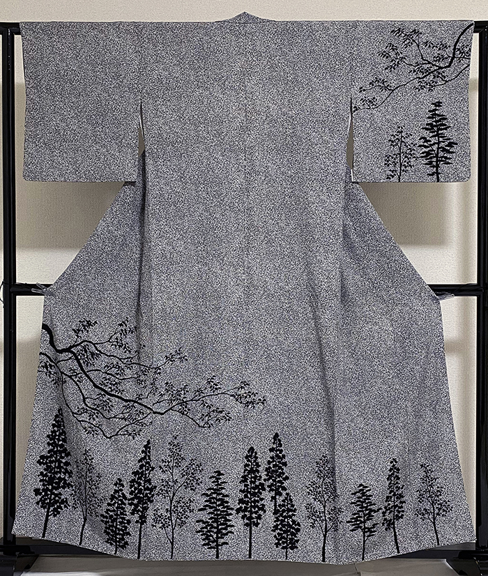 しなやかで柔らかな手触りの変わり一越織り生地で、白ネズ色の上に黒のロウ吹雪でタタキ染めし、その上の袖や上前に木立や葉柄を黒で染め上げた品。八掛けは正絹表色にタタキ柄を染めた品が付き胴裏は正絹が付いた手縫い仕立て。