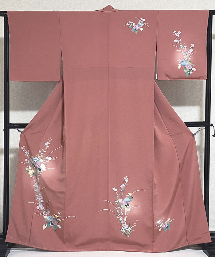 しなやかな手触りの変わり一越織り生地で、紅色が少し加わった優しいローズ色に染め、その上の花柄を薄緑色や水色に薄紫色と金茶色などを加えた手描き友禅で染め上げた品。八掛けは正絹ローズ暈しで胴裏は正絹が付いた手縫い仕立て。