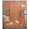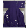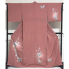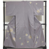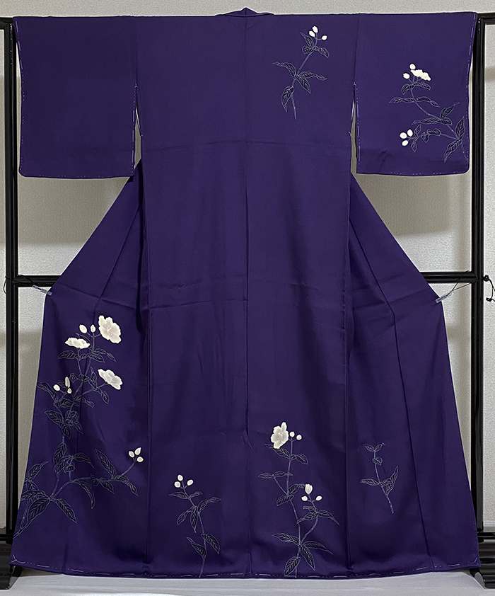 しなやかな良い手触りの紋意匠無地織り生地で、すっきりとした落ち着いた紫色に地染めし、その上に花柄を淡いベージュ色と少しの紅色を加え、枝の柄は黒に縁取りを白で染め上げた良い加工の品。八掛けは正絹表色無地で胴裏は正絹が付いた手縫い仕立て。衿裏にはホック代わりに糸が付いています。
