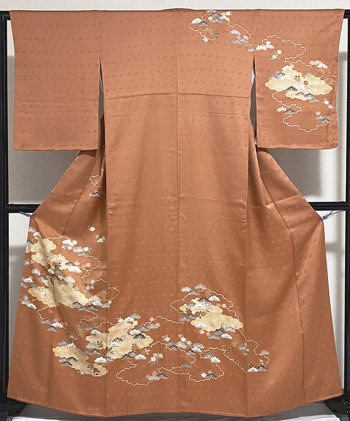 しなやかな手触りの小さなサヤガタに小花を織り込んだ紋意匠生地で、錆朱色の落ち着いた地色に染め、その上の雲や花柄を白に紫色や黄赤色と薄ネズ色に、柄の縁取りに金銀加工と、上前の一部に金糸刺繍を施した品。八掛けは正絹黄赤色暈しで胴裏は正絹が付いた手縫い仕立て。優しい青磁色の正絹重ね衿が付いています。衿裏にはホック代わりに糸が付いています。