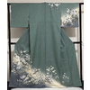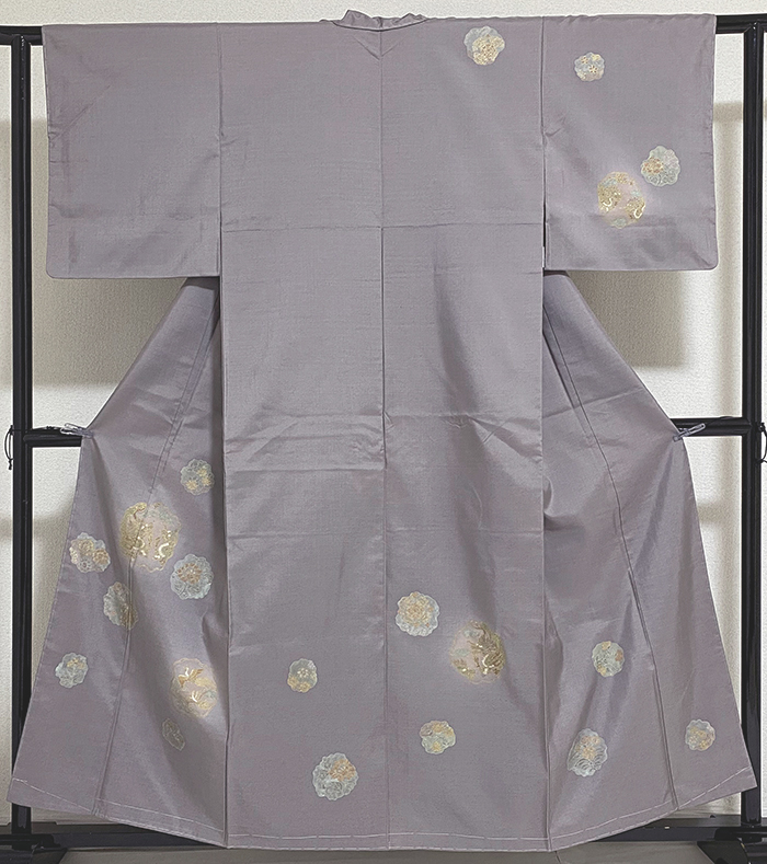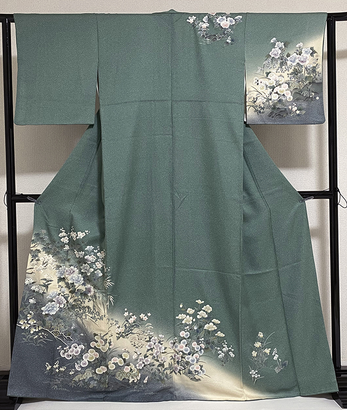 しなやかな確りとした良い手触りの変わり網代織りの紋意匠生地で、くすんだ青磁色に白ネズ色で霜降りに染め、裾には薄紫色を加えて暈し、その上の花柄をベージュ色や薄ピンク色に薄紫色と、縁取りに銀彩を加えて染めた加工の品。八掛けは正絹表色無地でオクミ裏に柄を置き胴裏は正絹が付いた手縫い仕立て。