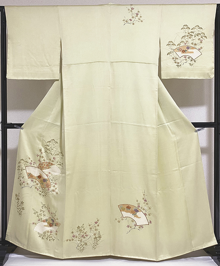 しなやかな手触りの小さな霜降り柄を織り込んだ紋意匠生地で、淡いベージュ色に少しの薄緑色を加えた地色に、上前の扇の柄には空絞りで加工し、花柄をウグイス色や黄赤色に紫色などを加え、上前の一部に手刺繍を施した加工の品。八掛けは正絹金茶色暈しで胴裏は正絹が付いた手縫い仕立て。 胴裏と八掛けの間に10センチほどの足し布があります。