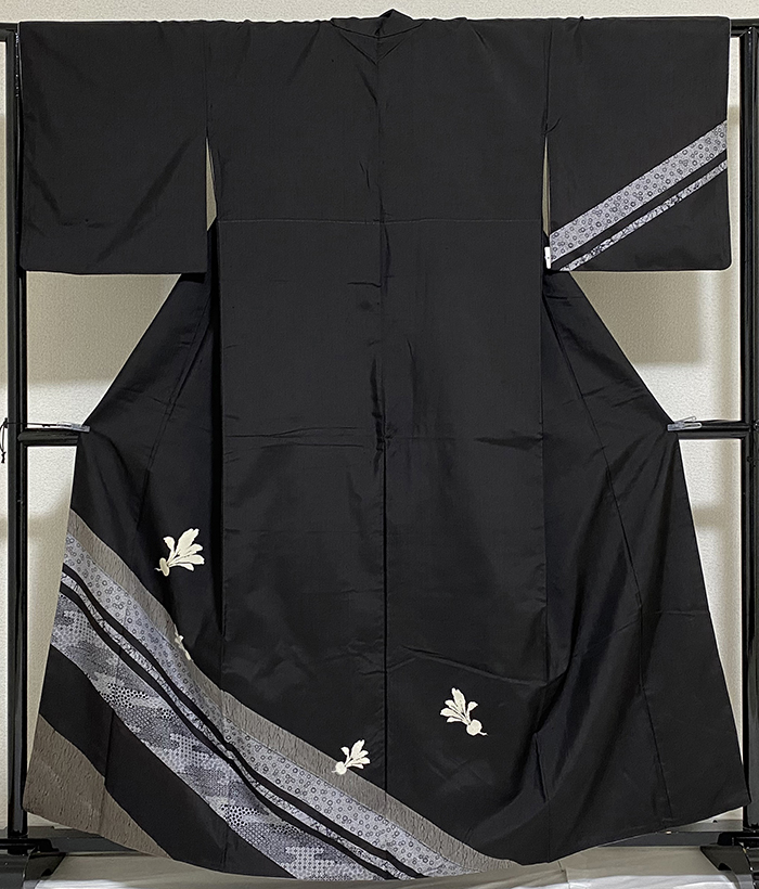 しなやかな良い手触りの趣のある小さなフシを織り込んだ紬織り生地で黒に地染めし、上前と袖に斜めの柄と白ネズと薄茶で江戸小紋の花や七宝などの柄を染め、上前には白でカブの柄を染めた品。八掛けは正絹藤ネズ色無地で胴裏は正絹が付いた手縫い仕立て。パールトーン加工済み、下前衿先裏にタグがあります。