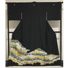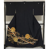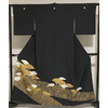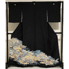 しなやかな良い手触りの変わり一越織り生地を黒色に染め、上前の流水と扇に松の柄を金彩と白に薄小豆色で染め、扇の部分に金加工と金糸刺繍を施した品。八掛けは正絹表色無地でオクミ裏に柄を置き、胴裏は正絹が付いた手縫い仕立て。正絹羽二重の比翼が付いています。全体にぐし縫いが施された丁寧な仕立てです。着物と比翼の衿裏にはホック代わりに糸が付いています。