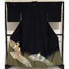 確りした手触りの良い変わり一越織り生地を黒色に染め、上前の薄ローズ色を濃淡に暈し、その上の屏風絵巻や扇に鳳凰などの柄を青緑色や薄紫色に薄ローズ色などと金加工で染めた品。八掛けは正絹表色無地でオクミ裏に柄を置き、胴裏はポリエステルが付いた手縫い仕立て。ポリエステルの比翼が付いています。全体にぐし縫いが施された丁寧な仕立てです。着物と比翼の衿裏にはくるみホックが付いています。