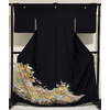 確りとした良い手触りの変わり一越織り生地をきれいな黒色に染め、上前からの鳳凰と熨斗目などの柄を青ネズ色と朱赤色などで染めた上に、白糸や薄藤色に黄赤色などの細かな刺繍と豪華な金駒刺繍を丁寧に施した品。八掛けは正絹表色無地でオクミ裏に柄を置き、胴裏は正絹が付いた手縫い仕立て。正絹羽二重の比翼が付いています。全体にぐし縫いが施された丁寧な仕立てです。着物と比翼の衿裏にはホック代わりに糸が付いています。