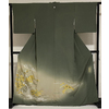 確りとした良い手触りの変わり一越織り生地をくすんだ緑色に染め、上前からの渋めのベージュ色で暈しの上に、とても細やかな手刺繡でや山並みや木立などの柄を白ネズや金茶色に青ネズなどの糸で刺繍した品。八掛けは正絹くすんだ緑色無地で、胴裏は正絹が付いた手縫い仕立て。衿裏にはホック代わりに糸が付いています。 とても細やかな刺繍には黄金糸、天蚕糸を使った得難い品です。