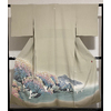 確りとした手触りの良い変わり一越織り生地をくすんだ水色に染め、上前には金糸で霜降りに織り込み、その上の風景庭園柄を緑色や海老茶色に白ネズなどで織り込み、その上に縁取りを金糸で施した品。八掛けは正絹表色無地で、胴裏は正絹が付いた手縫い仕立て。