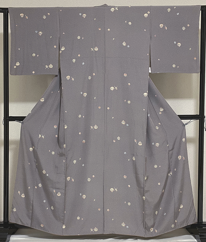 しなやかな手触りのとても細い糸で織り込まれた変わり一越の生地を薄ネズ色に地染めし、白でアラレの柄を染め、その上に玩具などの柄を黄赤色や青緑色などで重ね染めした品。両面仕様で、手縫い仕立て。 裏面は、表と同じ生地に金茶濃淡の縞柄で染め、小花の柄を白や黄赤色など重ね染めした品。 両面仕様なので八掛けや胴裏、衿裏にホックなどは付いていません。