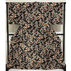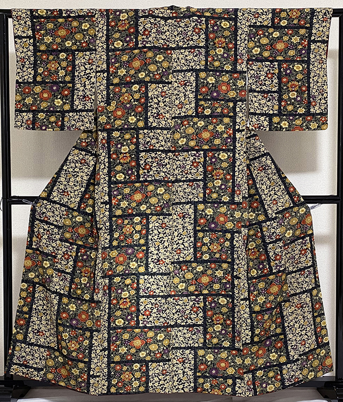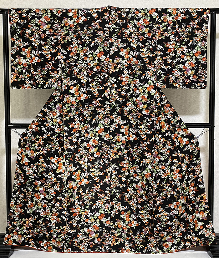 確りとした手触りの小さなアラレ柄を織り込んだ紋意匠生地で、黒の地色に、花柄を黄赤色や薄紫色に金茶色とほんの少しの金彩を加えて染めた品。八掛けは正絹鮮やかな黄赤色無地で胴裏は正絹が付いた手縫い仕立て。衿裏にはホック代わりに糸が付いています。