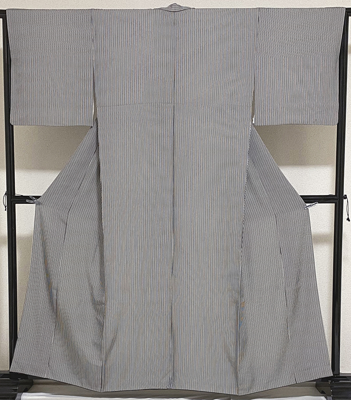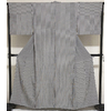 しなやかでスベリの良い変わり一越織り生地で、白黒で細縞を染めた品。八掛けは正絹黒色暈しで胴裏は正絹が付いた手縫い仕立て。衿裏にはホック代わりに糸が付いています。