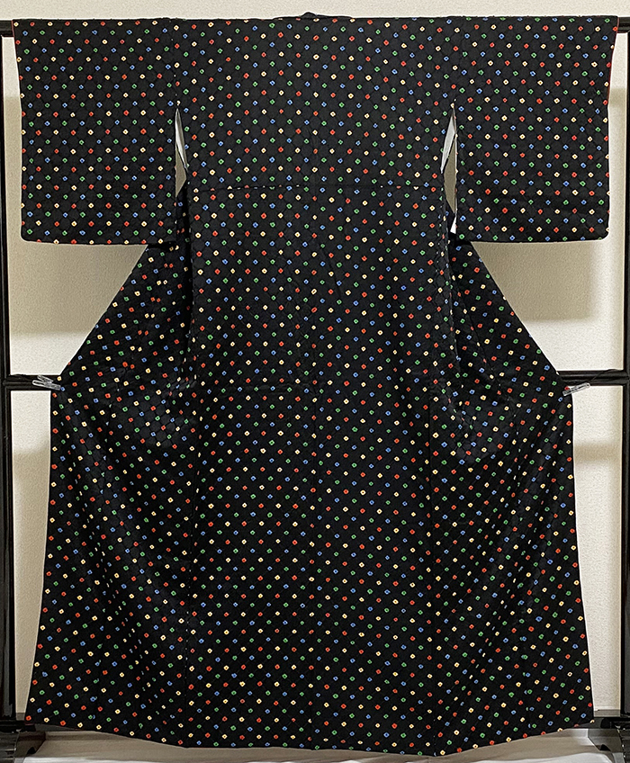 しなやかな手触りの斜め格子の地柄を織り込んだ紋意匠生地で、黒の地色に、小さなつまみ絞りに黄色や青色に赤色などを加え染めた品。八掛けは正絹黄赤色無地で胴裏は正絹が付いた手縫い仕立て。
