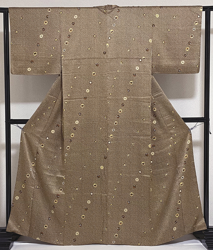 しなやかな手触りの紋綸子無地織り生地で、こげ茶色にくすんだ金茶色のアラレ柄を染め、丸取り家紋柄を黄赤色や薄紫色に地色濃淡などを加え染めた品。八掛けは正絹金茶色無地で胴裏は正絹が付いた手縫い仕立て。衿裏にはくるみホックが付いています。