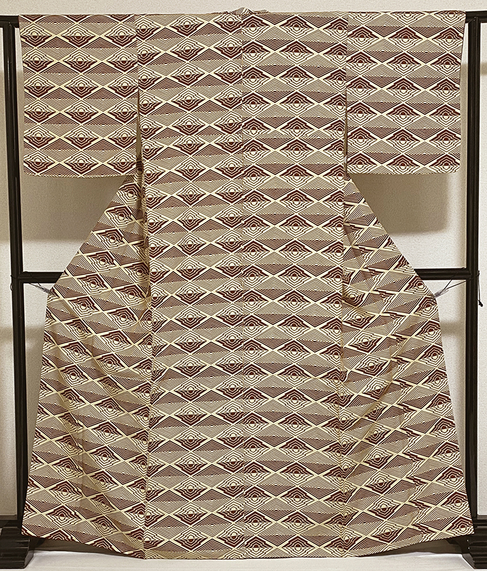 少し張りのある手触りのほんの少しの横段フシ糸を織り込んだ変わり一越織り生地で、ベージュ色とくすんだエンジ色で横段菱柄を染めた品。八掛けは正絹くすんだエンジ色無地で胴裏は正絹が付いた手縫い仕立て。