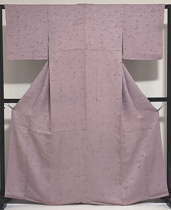 しなやかな手触りで光沢のあるの地柄を織り込んだ紋意匠の生地をに地染めし、重ね染めした品。八掛けは正絹暈しで胴裏は正絹が付いた手縫い仕立て。