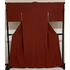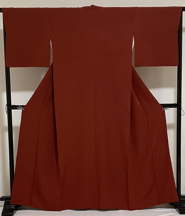 確りとした張りのある良い手触りの変わり一越の生地をくすんだエンジ色無地で染め上げた品。八掛けは正絹表色無地で胴裏は正絹が付いた手縫い仕立て。衿裏にはホック代わりに糸が付いています。