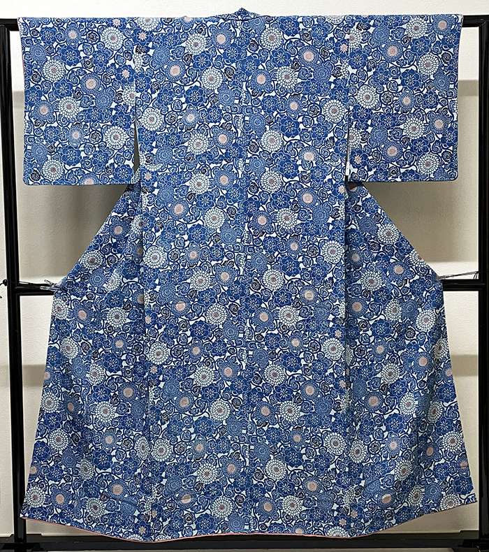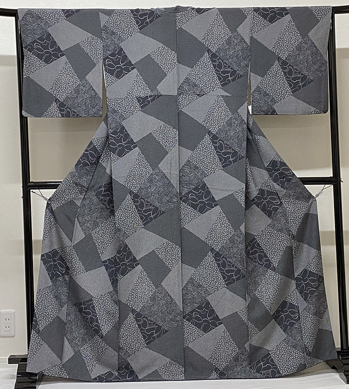 しなやかな手触りの変わり一越織り生地で、くすんだ紺色の地色に、キリバミに花などの柄を白や薄紫色で染めた品。八掛けは正絹江戸紫色暈しで胴裏は正絹が付いた手縫い仕立て。