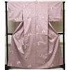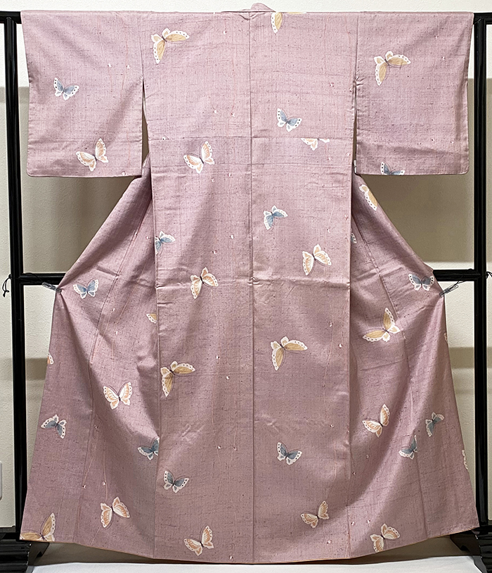 しなやかな手触りの小さなフシを織り込んだ紬織り生地で、くすんだ藤ピンク色の地色に、立涌と蝶の柄を珊瑚色と金茶色に青緑色などで染めた品。八掛けは正絹山吹色無地で胴裏は正絹が付いた手縫いのバチ衿仕立て。