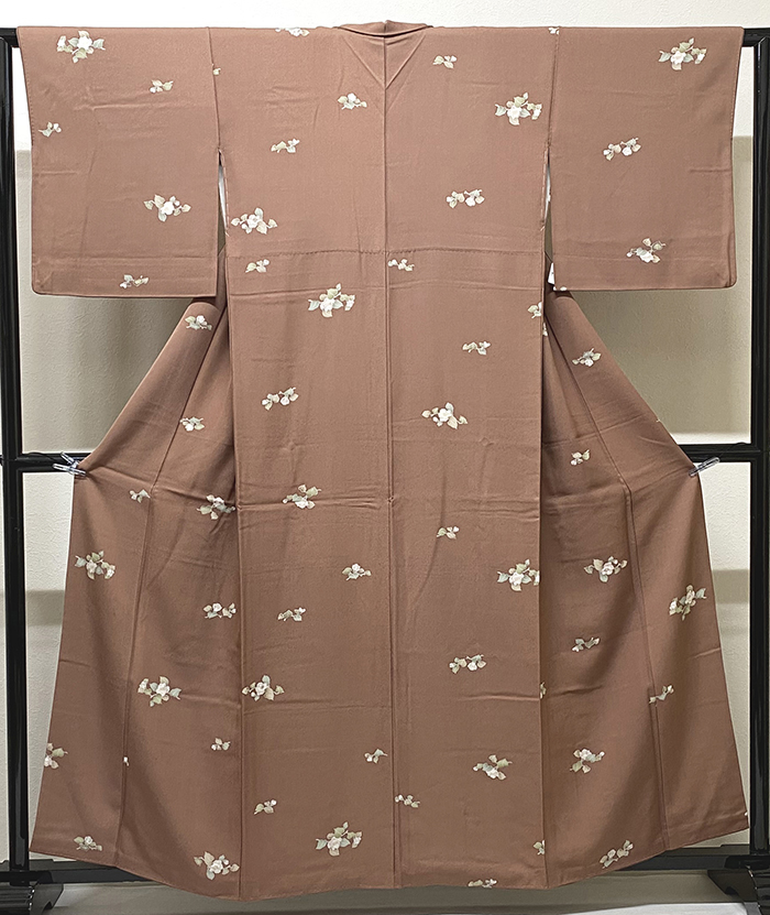 しなやかで手触りの良い小さなアラレ柄を織り込んだ紋意匠無地織り生地で、くすんだココア色の地色に、椿の花の柄を白と青磁色濃淡で染めた品。八掛けは正絹くすんだ表色無地で胴裏は正絹が付いた手縫い仕立て。
