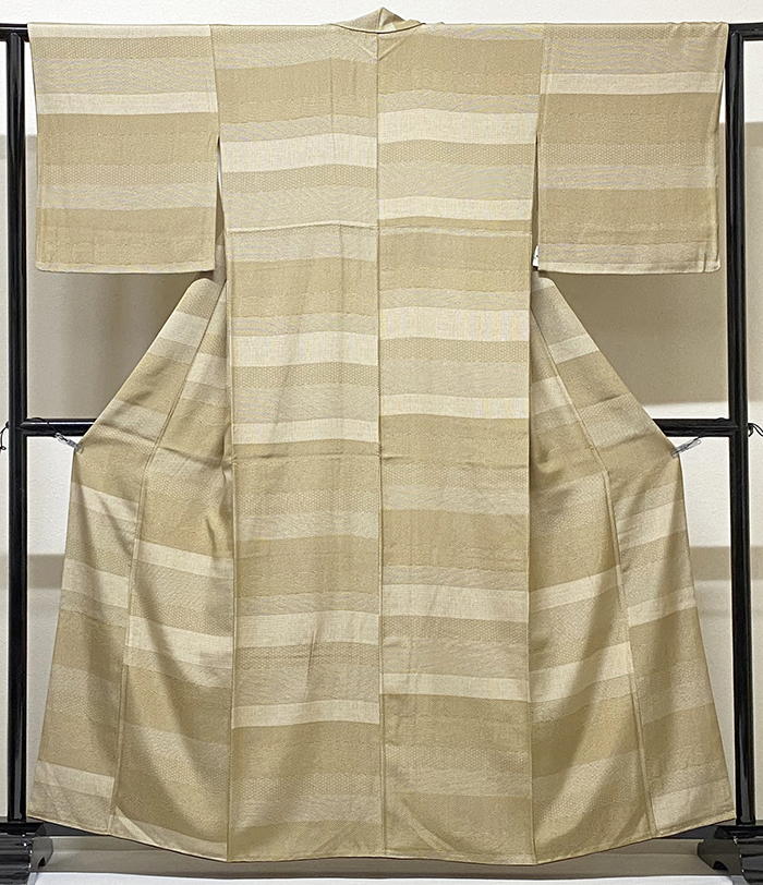しなやかな手触りのスベリの良い変わり一越織り生地で、白の地色に、くすんだウグイス色やベージュ色で横段取り寄せ江戸小紋の柄を細かく染めた品。八掛けは正絹濃いめ赤紫色暈しで胴裏は正絹が付いた手縫い仕立て。衿裏にはホック代わりに糸が付いています。