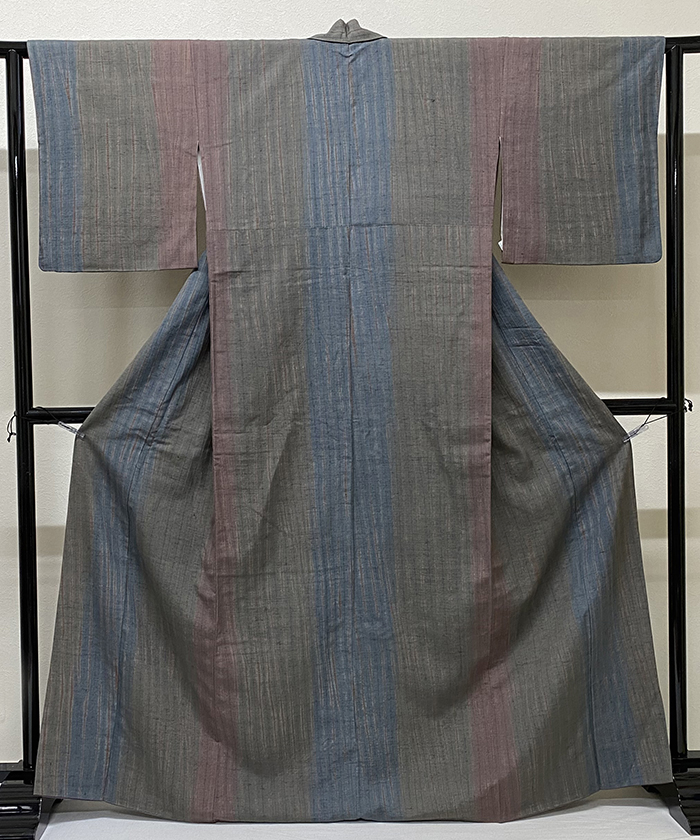 確りとした手触りの小さなフシを織り込んだ真綿紬織り生地で、くすんだ青緑色とウグイス色に少しの赤紫色を加え細縞に染めた品。八掛けは正絹薄紫色暈しで胴裏は正絹が付いた手縫いのバチ衿仕立て。