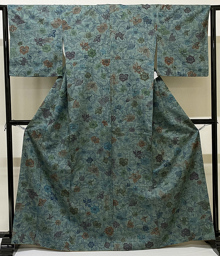 確りとした張りのある小さなフシを織を込んだ紬織り生地で、青緑色濃淡の地色に、蔓花の柄を青緑色やウグイス色に黄赤色などで染めた品。八掛けは正絹金茶色無地で胴裏は正絹が付いた手縫い仕立て。衿裏にはくるみホックが付いています。