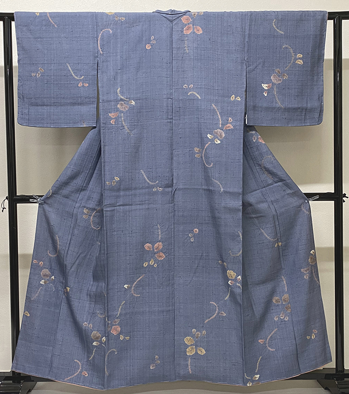 確りとした手触りの良い縮緬の織り生地を藍染め加工し、白ネズ色の地色に、蔓花柄を藍色濃淡と金茶やエンジ色などを少し加え染めた品。八掛けは正絹薄オレンジ色暈しで胴裏は正絹が付いた手縫い仕立て。