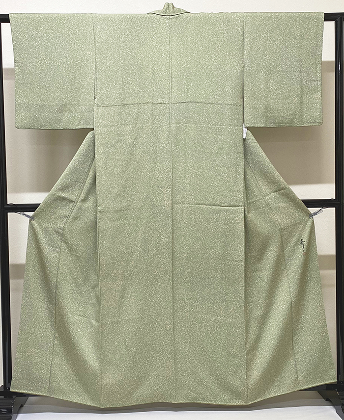 確りとした張りのある変わり一越織り生地で、薄緑色とベージュ色に少しの白を加えアラレに染めた品。八掛けは正絹ウグイス色暈しで胴裏は正絹が付いた手縫いのバチ衿仕立て。松井青々作、下前オクミに作家名と落款があります。