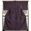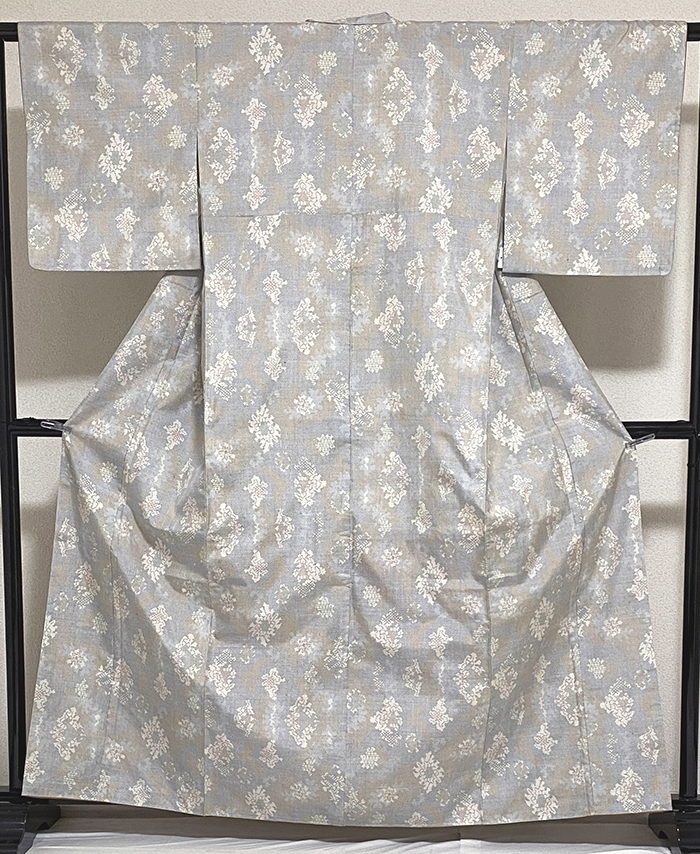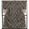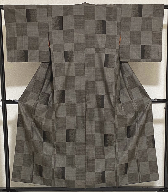 しなやかな手触りの良い小さな絣柄の大島紬織り生地で、白ネズ色とこげ茶色濃淡で市松に染め、絣柄を白ネズ色で織った品。八掛けは正絹紺色無地で胴裏は正絹黄赤色が付いた手縫い仕立て。