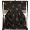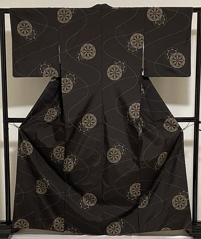 しなやかなスベリの良い大島紬織り生地で、黒に近いこげ茶色の地色に、源氏車と流水柄を薄茶色で少しの黄赤色を加えて織った品。八掛けは正絹黄赤色無地で胴裏は正絹が付いた手縫い仕立て。衿裏にはくるみホックが付いています。