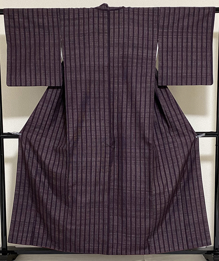 しなやかな良い手触りの真綿の糸で百山亀甲に織り上げた結城紬織り生地で、赤紫色の濃いめの縞柄と、亀甲柄に薄緑色を加え織った品。八掛けは正絹エンジ色無地で胴裏は正絹が付いた手縫い仕立て。