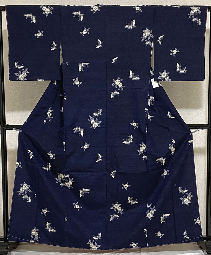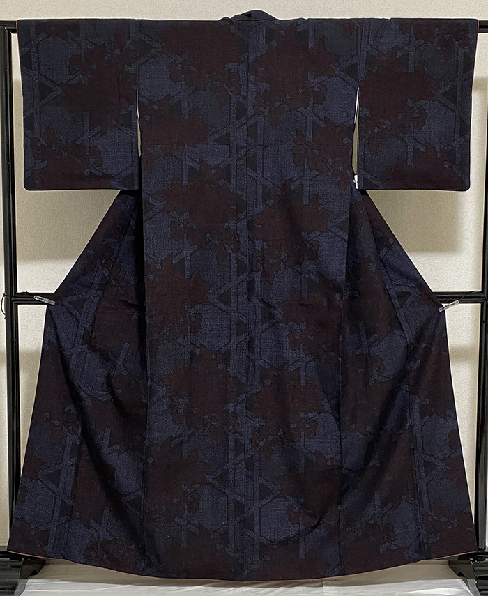 しなやかな手触りの八十山亀甲に織り上げた結城紬織り生地で、深い紺色の地色に、亀甲と花柄を青ネズ色にエンジ色を加え織った品。八掛けは正絹明るい黄赤色無地で胴裏は正絹が付いた手縫い仕立て。