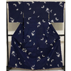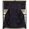 確りとした手触りの良い小さなフシを織り込んだ紬織り生地で、深い鉄紺色地織りに、花鳥柄を白と少しの薄緑色を加え織った品。八掛けは正絹珊瑚色無地で胴裏は正絹が付いた手縫い仕立て。衿裏にはくるみホックが付いています。