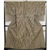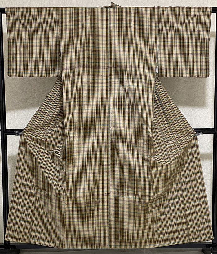 確りとした張りのある小さなフシを織り込んだ紬織り生地で、薄茶色の地色に、格子横段柄を青やエンジ色に金茶色などを加え織った品。八掛けは正絹青磁色無地で胴裏は正絹が付いた手縫いのバチ衿仕立て。