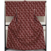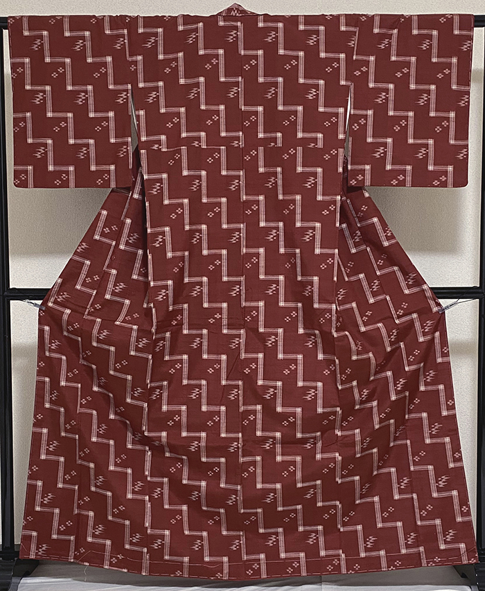 しなやかな張りのある小さなフシを織り込んだ琉球絣紬織り生地で、くすんだエンジ色の地色に、ツバメなどの柄を白ネズ色で織った品。八掛けは正絹少し濃いめのエンジ色無地で胴裏は正絹が付いた手縫い仕立て。